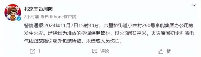 11月7日晚,北京市丰台区消防支队发布警情通报,2024年11月7日15时34分,六里桥街道小井村290号京能集团办公用房发生火灾。燃烧物为堆放的空调保温管材,过火面积3平米?;鹪衷虺醪脚卸系缙呗饭收弦纪獍八?,未造成人员伤亡。